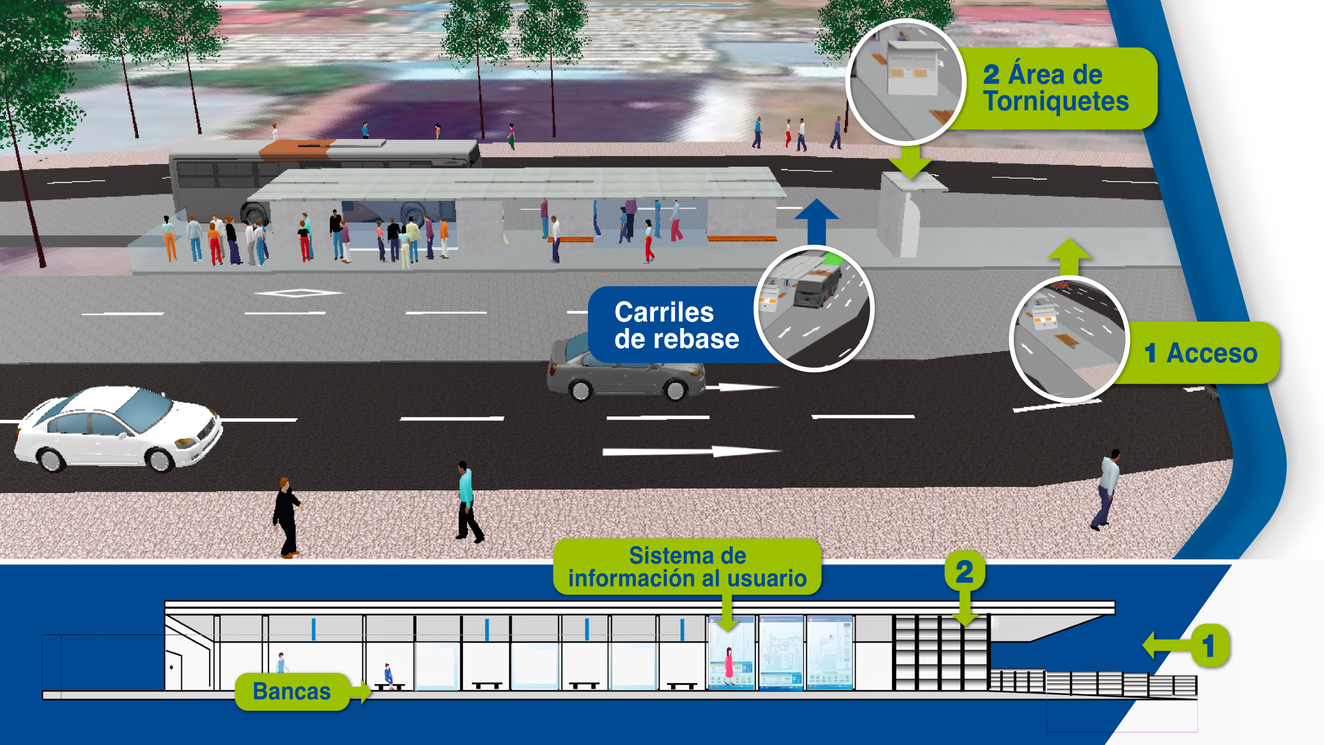Las estaciones tienen previsto un carril de rebase por sentido, por donde los buses continuarán su recorrido mientras otro bus esté detenido para el ascenso y descenso de pasajeros.