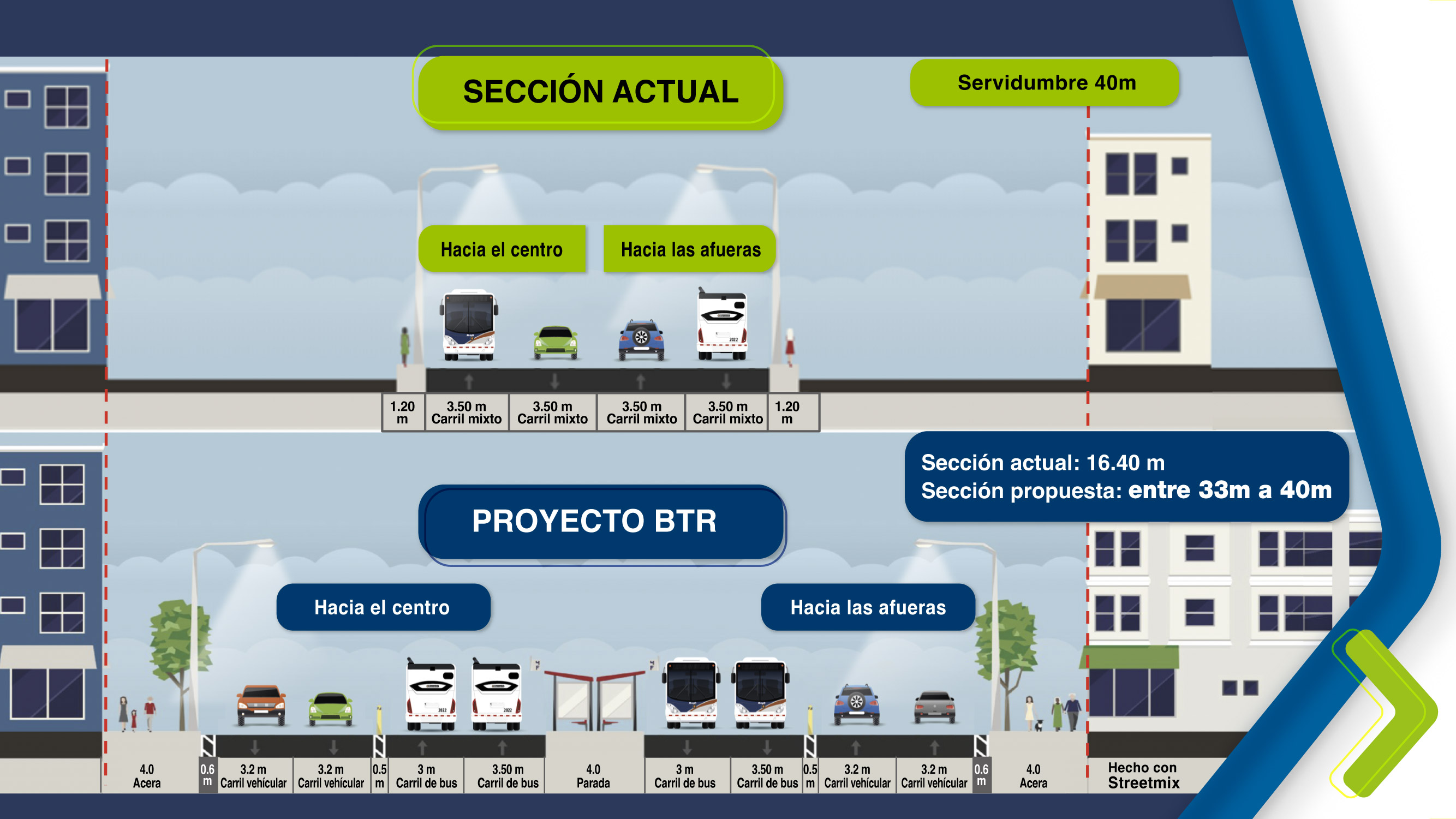 El proyecto incluye por seguridad la construcción de barreras de 50cm de altura y 30cm de ancho para separar físicamente la circulación entre el carril del BTR y los carriles mixtos.